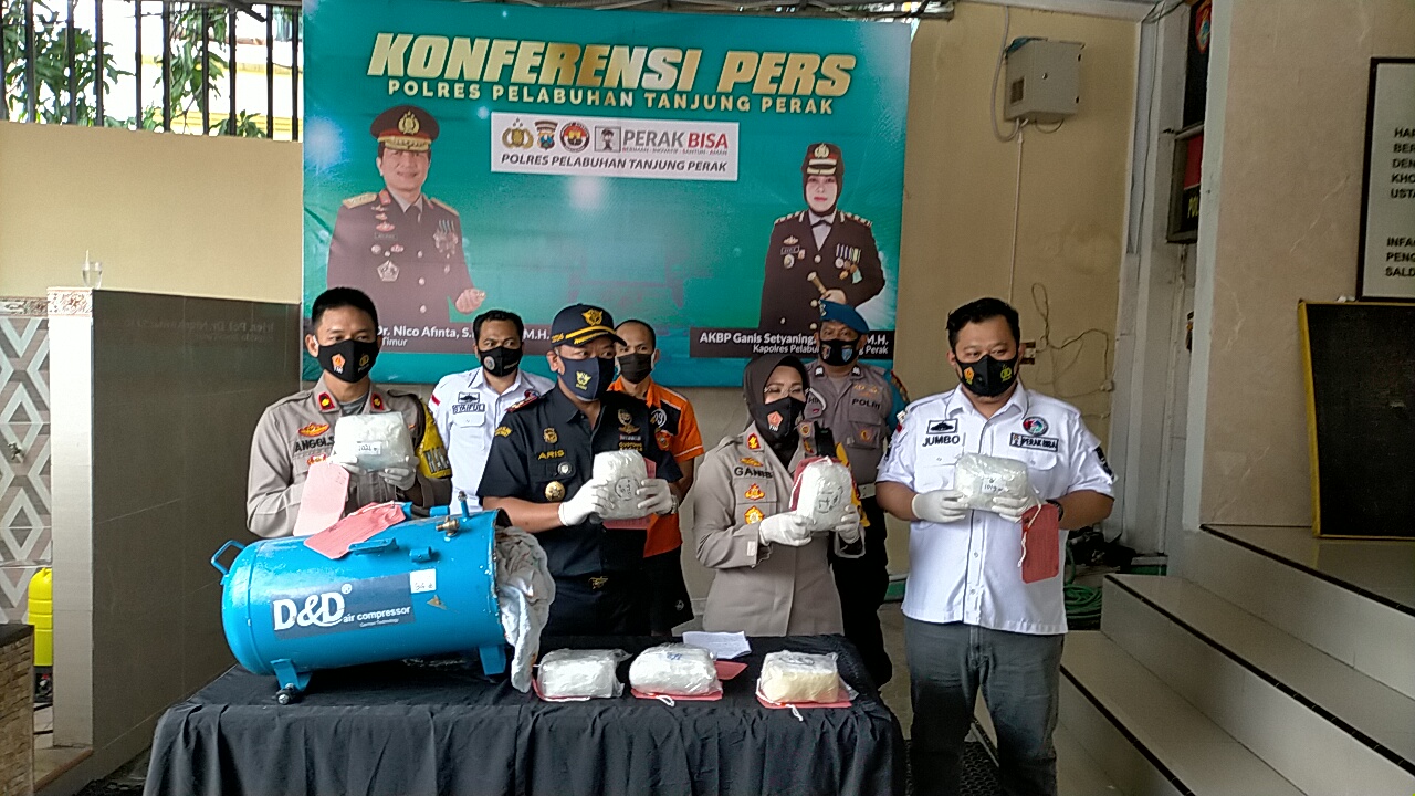 Dari ungkap kasus ini, Polisi berhasil mengamankan satu pelaku dan juga menyita lebih dari 7 Kg serbuk putih yang disembunyikan dalam sebuah kompressor angin.