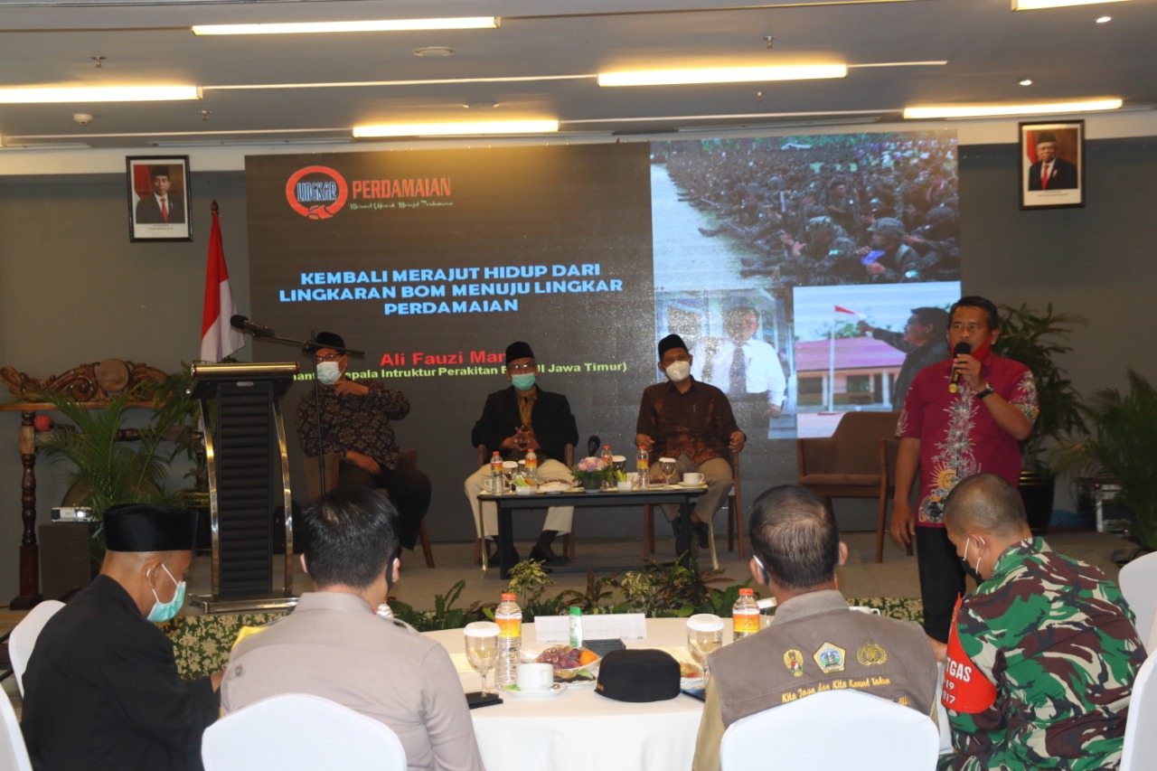 Dalam giat Diskusi kali ini Juru Bicara(Nara Sumber) dari IAIN Guru Besar Prof.Dr.KH.Ahmad Imam Mawardi,.M.A bersama Ust.Ali.Fauzi Manzi,.M.Pdi(Dir.Yayasan Lingkar Perdamaian/Mantan KA.Instruktur Perakitan Bom JI Jatim),Ketua PCNU Gresik KH.Muh.Chusnan Ali dan Ketua PD Muhammadiyah Gresik Dr.H.Taufiqullah Ahmadi